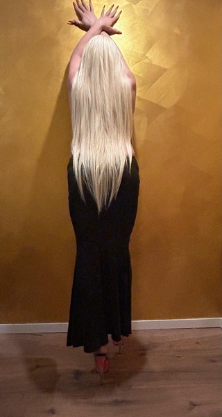 Haare:blond, rückenlang, glatt